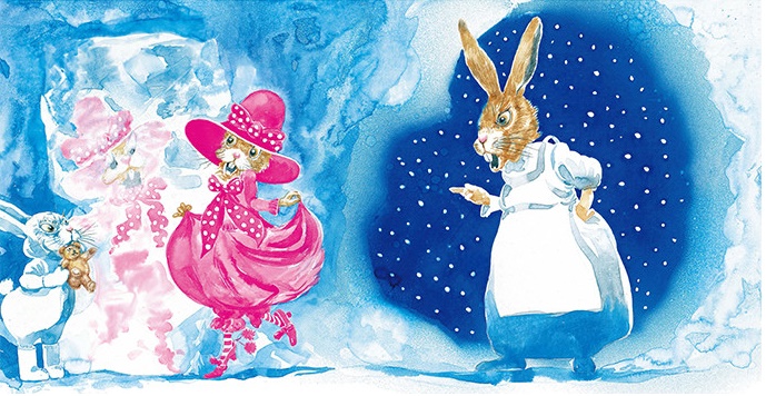 北极地区的野兔们,到了冬天会换上雪白的冬衣。有一只小兔子却不愿意,偏要穿上粉红的裙子,戴上粉红的帽子——这样才漂亮嘛!她不顾妈妈和姐妹们的反对,跑出了家门,一点儿也没发现:所有的北极熊都看见了白雪上的粉红小兔子,等着吃烧兔肉呢……