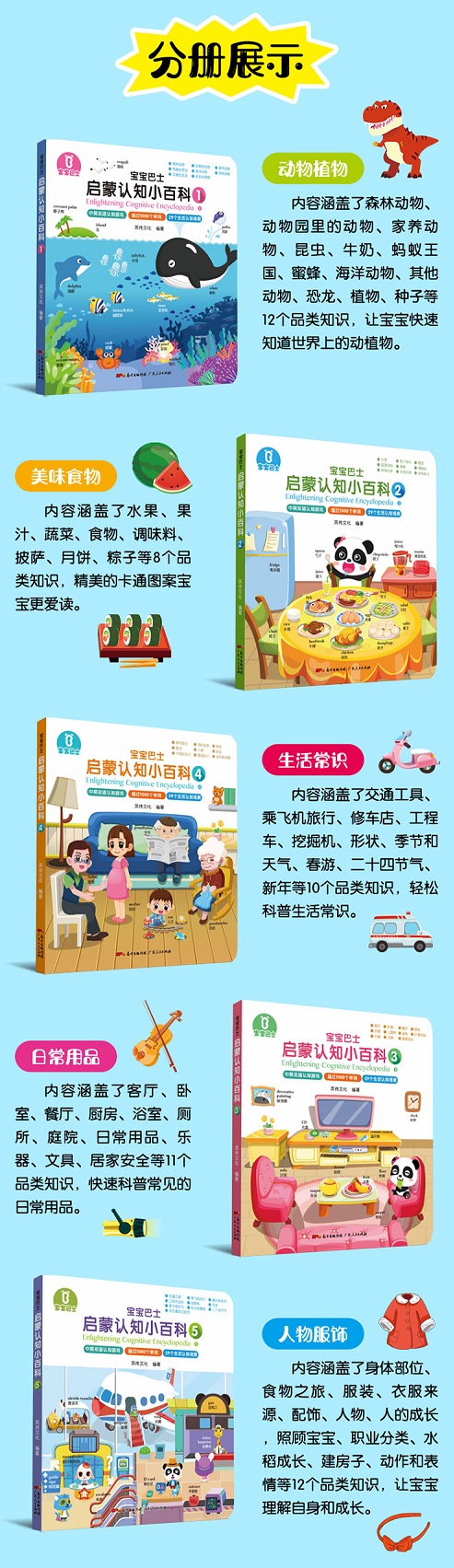 本书为0—4岁幼儿启蒙认知读物,内容涵盖小朋友们在生活中几乎全部会接触到的事物,按照物品属性或者场景不同来分类,并且从易到难进阶排序。本书采用生动有趣的卡通图鉴形式,并附有中英双语。包含12幅跨页,总计近200种常见的身边事物的认知,包括水果、蔬菜、食物、玩具、动物、交通工具、数字、形状、颜色、服装饰品、身体等。