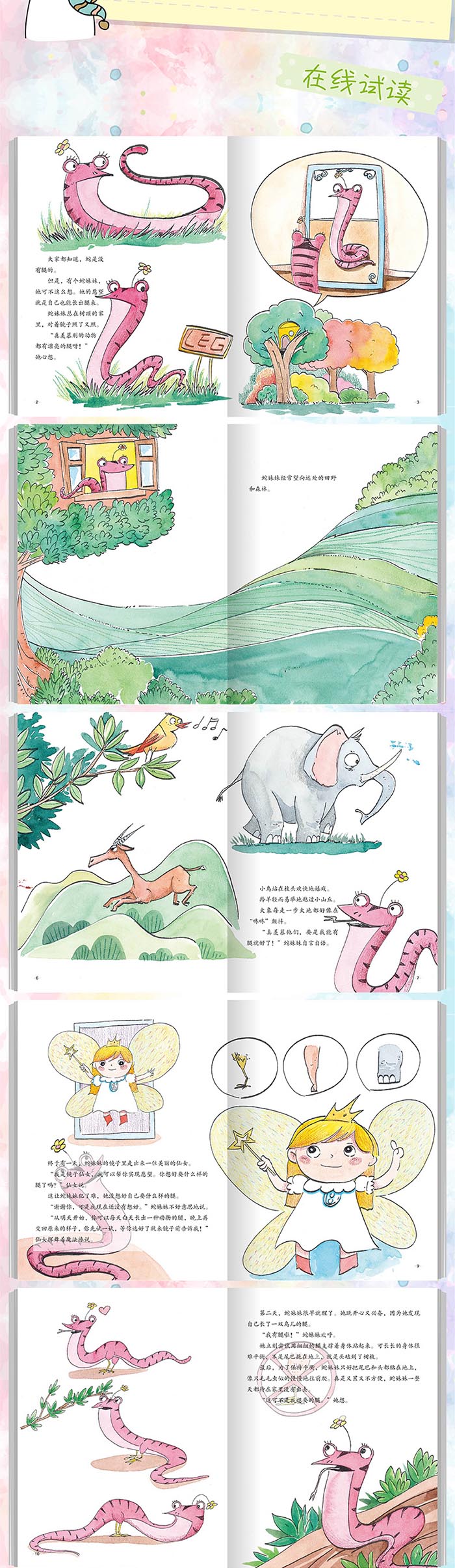 蛇是没有腿的,大家都知道。但蛇妹妹却很羡慕其他动物都有腿。有一天,她遇到一个仙女,仙女答应帮她变出了腿。这让她犯了难,因为她不知道自己想要谁的腿。仙女建议她都尝试一下。一天,蛇妹妹开心的发现自己长了一对小鸟的腿;第二天,自己的腿变成了马儿的蹄子;第三天,她又长出了大象的腿。长着这些腿,蛇觉得还是自己原来的样子好,适合自己。于是,蛇又变回了没有腿的样子。她再也不羡慕别人了。