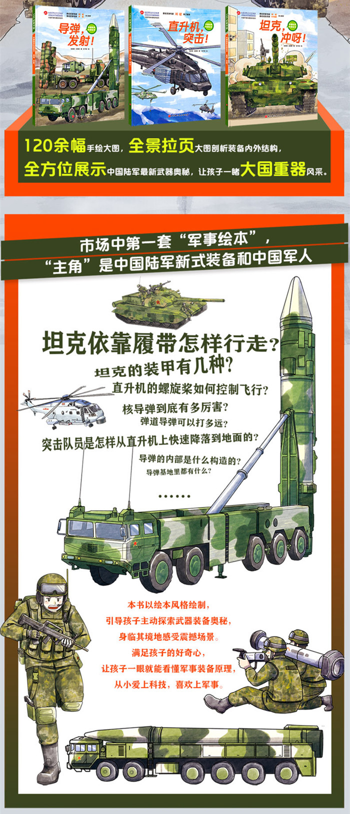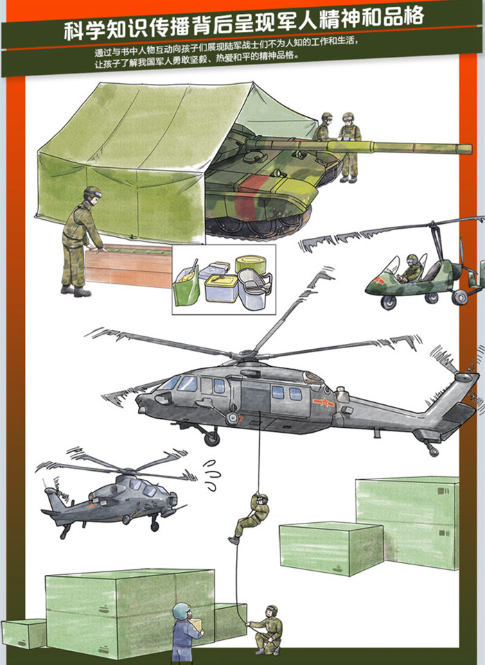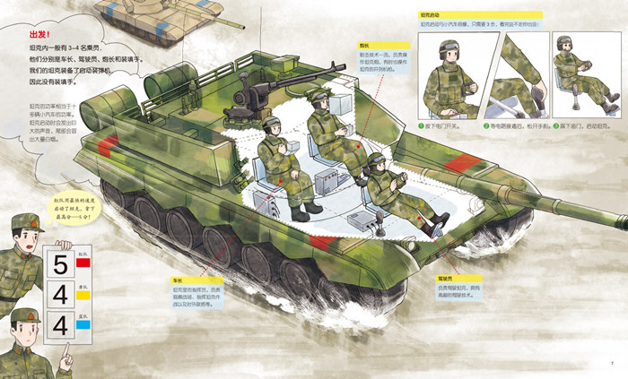 一本专门为小朋友量身打造的国防军事科普绘本,是中国陆军科普绘本系列的册,本书内容包括坦克的人员配备、工作生活、行驶原理、弹药补给点寻找任务等,以“实习小战士”参加靠前坦克大赛、在训练场与参赛坦克争夺优选为主题场景,将坦克的内部构造、主要武器、履带前进原理、坦克兵作战技能等专业难懂的知识,用小朋友易于理解和接受的方式,作了比较准确的表述。书中蕴含丰富的兵器以及国防相关知识点,兼具趣味性和可读性,能够满足孩子们对坦克的好奇心和求知欲。让读者逐步了解坦克结构、装备功能等相关知识,体会陆军官兵生活,理解军人的勇气和坚毅,认识军人崇高神圣的职业。