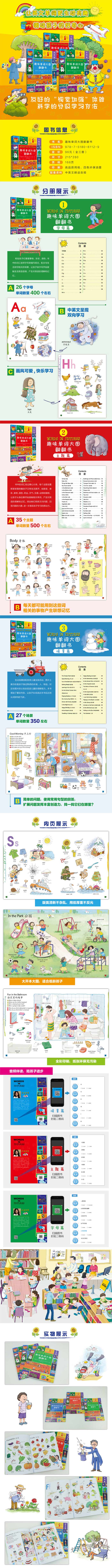 《趣味单词大图翻翻书》(全三册)是一套专为儿童编写的双语词汇启蒙书,本套书共三本,按照词汇的难度和儿童年龄段的不同认知,分字母篇、主题篇、情景篇三个阶段。每本书描绘了不同主题,涵盖了大约1200个生活常用词。主题中以图片为主设置有趣的场景,通过画面植入相关物品的单词中英文,加深孩子对单词的记忆。情景篇中设置了问题与句型,实现了从单词到句子的飞跃。本套书配有音频文件,适合孩子听、说、读、学的同步发展。