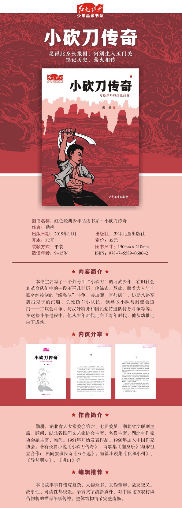 本书是一部由“前篇”和“后篇”两部分组成的长篇小说,写一个叫“小砍刀”的习武少年,在旧社会和革命队伍中的一段不平凡经历。他练武;他熬盐;他跟着大人与土豪劣绅控制的“缉私队”斗争;他协助八路军伏击鬼子的汽船;他杀死伪军小队长;他领导区小队与汉奸特务和国民党特遣队特务斗争……在这些斗争过程中,他从少年时代走向了青年时代,他从幼稚走向了成熟。本书故事错综复杂,真伪难辨,敌友交叉,具有极强的可读性。本书基调朴实,文字清新,犹如在你的面前展开了一轴北方农村的风俗画长卷。8.排检项主题词分类号本书是一部由“前篇”和“后篇”两部分组成的长篇小说,写一个叫“小砍刀”的习武少年,在旧社会和革命队伍中的一段不平凡经历。他练武;他熬盐;他跟着大人与土豪劣绅控制的“缉私队”斗争;他协助八路军伏击鬼子的汽船;他杀死伪军小队长;他领导区小队与汉奸特务和国民党特遣队特务斗争……在这些斗争过程中,他从少年时代走向了青年时代,他从幼稚走向了成熟。本书故事错综复杂,真伪难辨,敌友交叉,具有极强的可读性。本书基调朴实,文字清新,犹如在你的面前展开了一轴北方农村的风俗画长卷。