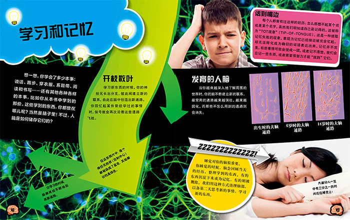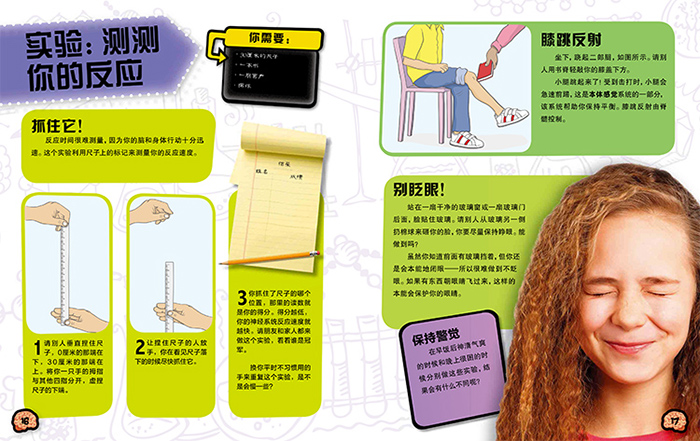 以大脑为主题,介绍了大脑的各个组成部分,具备的记忆和视觉、听觉、味觉、嗅觉等各种感觉功能,并提供了1个游戏和3个实验,如用抓尺子测量大脑反应速度,制作大脑模型等,让小读者全面深入了解大脑。