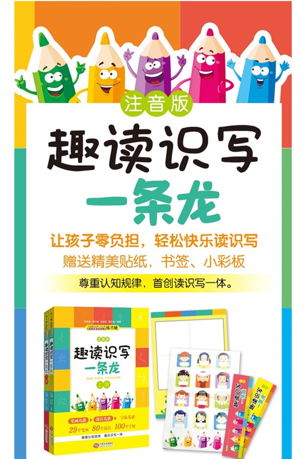 《趣读识写一条龙》(全2册)是由海量阅读团队名师朱霞骏老师,联合“课内海量阅读”创始人韩兴娥老师,国内著名儿歌专家吴昌烈老师,“字族文识字”创始人鄢文俊老师及集美大学汉字学专家金文伟教授,着力为小学生打造的一套识字写字书。全书上下册,上册为 29个笔画三字谣、80个部首230首部首儿歌;下册为100个字根,103首字族儿歌。