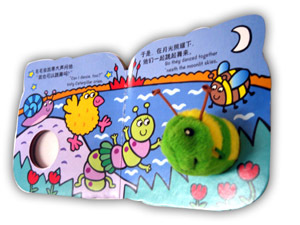 相信第一眼看到这套造型奇特的书时,孩子们就会立即被它所吸引——不拘一格的外形设计,生动绚烂的画面,还有可爱调皮的布偶虫子,它正从书洞中探出毛茸茸的脑袋朝你微笑……这套从英国原版引进的中英双语读物手指布偶书,简单而生动有趣的故事情节和温馨亲和的材质最适合亲子阅读玩耍,也适合孩子们之间的互动游戏。摇摆的虫子四本书分别以毛毛虫、蜜蜂、蜗牛、瓢虫四种小虫子为主角,讲述了一个个简单而精彩的故事。缀在书芯中间,阅读时手指可以掌控玩耍的小虫子布偶会让孩子惊喜不已,在边读边玩中得到乐趣,并开启心智。