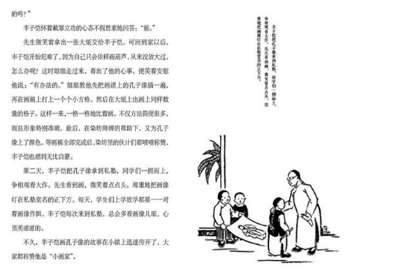 先生微笑着拿出一张大纸交给丰子恺。可回到家以后,丰子恺开始犯难了,因为自己只会依样画葫芦,从来没放大过。怎么办呢?这时姐姐走过来,看出了他的心事,便笑着安慰他说:“有办法的。”姐姐教他先把画谱上的孔子像描一遍,再在画稿上打上一个个小方格。然后在大纸上也画上同样数量的格子。这样一来,一格一格地比着画。不仅方法简便很多,而且形象特别准确。最后,在染坊师傅的帮助下,又为孔子像上了颜色。等画稿全部完成后,染坊里的伙计们都啧啧称赞,丰子恺也感到无比自豪。