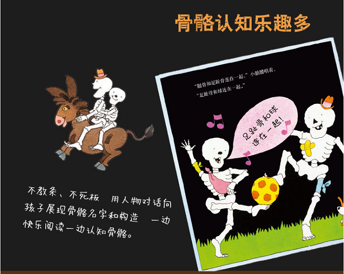 本系列图书讲的是一个大骷髅人和一个小骷髅人还有一只骷髅狗的趣味故事。故事文字简单,朗朗上口,便于孩子理解。图画干净利落,是骨骼启蒙书非常不错的选择。在大骷髅人、小骷髅人和骷髅狗的日常故事中展现情节与语言上的幽默性,有助于5-10岁的儿童学习基础词汇与句型,学会欣赏和使用韵律,学习拟声词及标点符号的使用。通过本书,可以让孩子初步了解骨骼,并绘制和标记人类/动物骨骼。图画方面,黑底与白色的大面积运用有助于形成对比,并引入黑夜与白天的话题讨论。同类图书有“骷髅狗”“飘着幽灵的小房子”“植物大战僵尸 科学漫画系列”等。