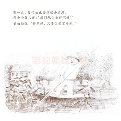 《和甘伯伯去游河》是约翰•伯宁罕的作品,他构思的是一个非常单纯的故事,单纯的感觉像一个幼儿:甘伯伯有一条木船,他的家就在河边。有一天,甘伯伯撑船去游河。两个小孩子、兔子、猫、狗、猪、绵羊、鸡、牛和山羊,一一要求上船。起初情形还好,后来这些乘客都忘了遵守秩序,忘了坐船的规矩。结果,船翻了,大家都掉进水里。甘伯伯带领大家游泳到岸边,让太阳把他们的衣服和身子晒干。和气的甘伯伯还邀请这批乘客到他家去喝茶,并且提议过几天大家再来坐一次船。