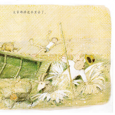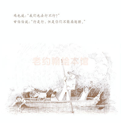 虽是一个简单的故事,但是很温馨,动物与人能和谐相处,每个动物、每个人又有着鲜明的个性特点和行为特征。每一只动物的出现和甘伯伯说的话需要特别注意。猫追兔子、狗讨厌猫、猪爱摇晃、绵羊爱咩咩叫、山羊爱踢人、鸡爱到处乱飞,呵呵,最终在船上他们的本性都毫无顾忌的表现出来。