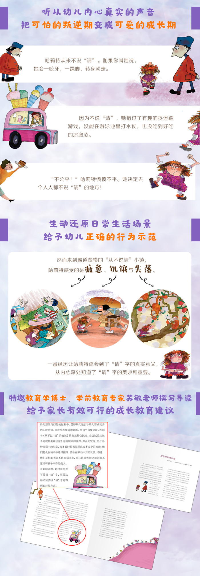 哈莉特从来不说“请”,也不喜欢被要求说“请”,于是她决定去找一个从来不说“请”的地方,竟然真的找到了。可是,在那里她并没有如愿以偿。一个转机让哈莉特变成了总是说“请”的懂礼貌的孩子,并因此得到了她想要的东西。五到六岁的孩子正处于叛逆期,本书以巧妙的方式帮助孩子认识到礼貌的重要性,整部作品充满稚拙、天真的童年气息,风趣幽默的绘画语言生动自然,另小读者感同身受。 这是一本指导儿童习惯养成的图画书,适合3~6岁的孩子阅读。 编辑推荐: 1.听从幼儿内心真实的声音,把可怕的叛逆期变成可爱的成长期。 2.生动还原日常生活场景,给予幼儿正确的行为示范。 3.教育学博士、学前教育专家苏敏老师撰写导读,给予家长有效可行的成长教育建议。