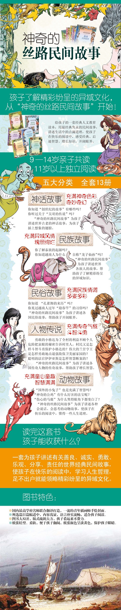 ※由国内高等学府名师联合翻译打造,品质有保障。 ※给孩子的一套经典人文教育读本,用经典隽永的民间故事,讲述深刻的道理,使孩子在快乐的阅读中,感受经典,启迪智慧,增长知识,开阔眼界。 ※所选篇目篇幅适中,内容浅显,语言朴实流畅,适合9-14岁孩子阅读。 ※图书大32开,字号较大,纸张轻型,符合9-14岁孩子阅读习惯。