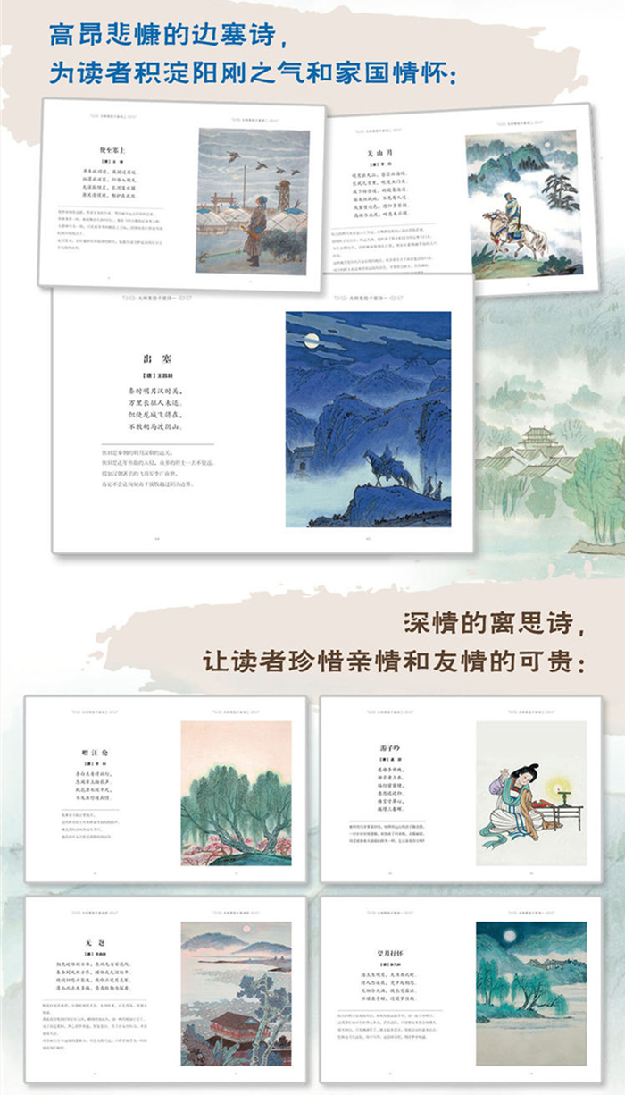 《大师美绘千家诗一》选取了汉代至唐代的古诗代表作,如《观沧海》《归园田居》《春江花月夜》《春晓》《过故人庄》等。