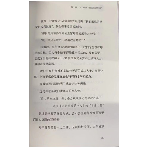 “这简直就是一所奇迹幼儿园!”参观者都发出这样的感叹!作者是92岁繁子奶奶教师,她从事幼儿教育60年,教过2800多名孩子。更奇迹的是,这个幼儿园的育儿方式:不强制睡午觉、不命令孩子、允许孩子带玩具、吃饭由孩子自己决定、等孩子自己想学时再教、由大孩子带小孩子、老师不会命令孩子必须上什么课程等等,每个家长都热情高涨:“一定要让孩子在这里上学!”幼儿园的理念把孩子视为一个个小小的奇迹,支持每个孩子竭尽全力绽放自己的人生。小学老师们说,每年最期待的就是奇迹幼儿园孩子的表现,他们可能在1-3年级成绩不明显,但到了5年级成绩就会有突飞猛进的进步。“我想做”“我能行”“全力以赴”,正是在幼儿园积累专注于自己选择事情的经验,让孩子在成长中迸发出极大的力量。当他成为大人,找到自己真正想努力做的事情时,这种经验将会成为他无穷力量的源泉。