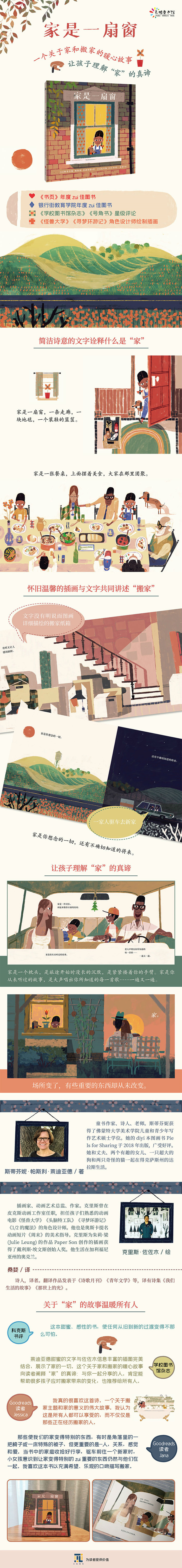 家是什么?家可以是很多东西,可以是一扇窗,一条走廊,一块地毯……一声问候或一个拥抱。家里的一切总是让我们感到舒适和安全。但有时候,事情会□化——人们为搬往新家,不得不离开原来的家。 童书作家、诗人斯蒂芬妮·帕斯利·莱迪亚德用简洁而温馨的文字,前皮克斯动画师、插画家克里斯·佐佐木用色彩柔和、充满细节的插画,共同为我们带来这本触人心弦的图画书,描述了一个家庭从原来心爱的家搬往新家的过程,以及由此引发的对“家”的感悟。