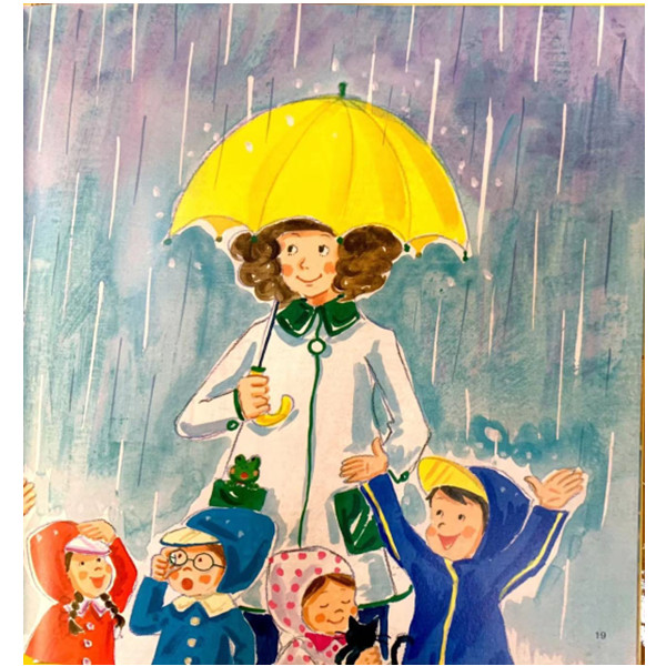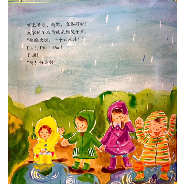 下雨了。蒲公英班的孩子们原本不开心的孩子们,跟随老师跑进雨中,发现了一大堆趣事。他们跟喜欢雨天的小青蛙们成为了好朋友,一起嘻嘻哈哈地唱歌,玩耍。正因为心中充满阳光,才会产生“这雨真了不起,玩得真痛快!”这样的感受。