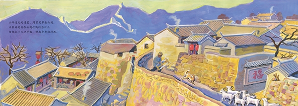 记得十年前,我同画友为宣传和保护古村落而去北京市门头沟区爨底下村采风创作时积累了很多艺术素材和感受。这一次接受《龙的高跷》的绘画委托,一下子勾起了我创作的情绪冲动。这本书我借鉴了年画的手法,采用厚重的水粉颜料,画出浓墨重彩的民俗氛围,并且给人物加以粗犷的勾线,使得动作表现生动有力。故事的时代背景设定为20世纪五六十年代,人物的服饰、孩子的玩具、生活的用具,都有意识地推移到那个年代,和现代社会拉开一段距离,呈现出质朴的乡土气息。