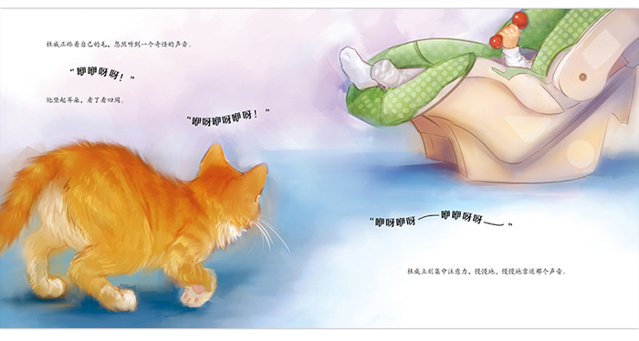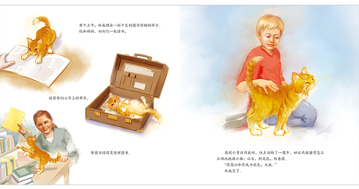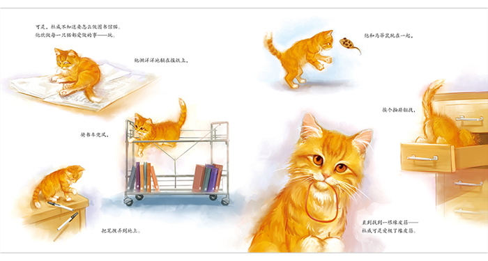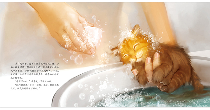 全书画面细腻优美,小猫杜威金色的毛发,水彩绘制营造出来的柔和环境,为这个温暖的故事更添一层柔和的光晕。