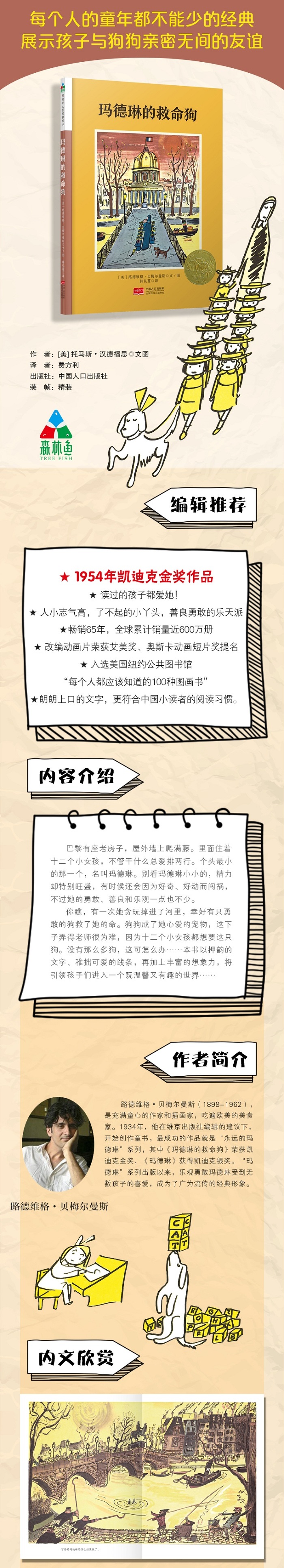 路德维格·贝梅尔曼斯(1898-1962),充满童心的作家和插画家,吃遍欧美的美食家。1934年,他在维京出版社编辑的建议下,开始创作童书,最成功的作品就是“永远的玛德琳”系列,其中《玛德琳的救命狗》荣获凯迪克金奖,《玛德琳》获得凯迪克银奖。“玛德琳”系列出版以来,乐观勇敢玛德琳受到无数孩子的喜爱,成为了广为流传的经典形象。