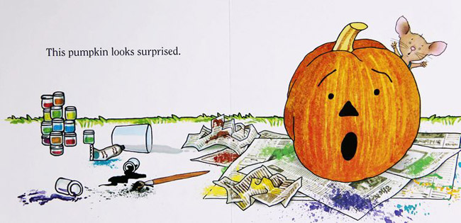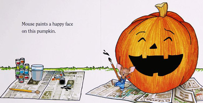 如果你让老鼠吃饼干,麻烦连连。不让老鼠吃饼干,总该让它干点别的啥吧?来吧!画画南瓜总可以吧!拿来7个南瓜。先画个开心南瓜,再来个悲伤的南瓜,生气的、惊喜的......南瓜怎么了,在害怕啥,看那表情,原来是背后藏着.....