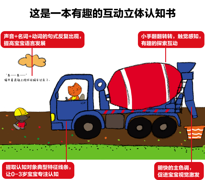 给0-3岁宝宝的互动立体认知书来啦!反复简单的排比句式,有趣的故事情境,明快的色彩、简单的特征造型,符合0-3岁宝宝的认知特点。小手翻翻动动,探索游戏中提高宝宝的专注力、手脑协调能力,发展手部精细动作,在有趣的游戏中学习认知,培养阅读习惯和兴趣。翻开看看,原来挖掘机的大铲子是这样工作的呀!原来推土机是这样推土的呀!原来压路机是这样把路轧平的呀!原来混凝土搅拌运输车是这样搅拌的呀……小小的探索中不仅认识了各种工程车,更培养了宝宝探索知识的兴趣,让宝宝的思维和身体一起动起来!