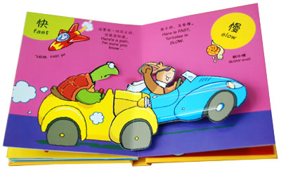 真是特好玩的书, 打开立体玩具书,一跃而出的多变会动的立体造型,丰富绚烂的色彩和趣味盎然的图形文字,带来不同于看平面书和玩玩具的巨大惊喜体验!翻动书页,蝴蝶会飞、小兔子的手臂在摇动,大鲨鱼的嘴巴一张一合,小老虎困了打哈欠又闭上眼睛,毛毛虫会爬、小猪会跑、飞机会飞....色彩艳丽,形象逼真,特别做成了64的小开本,1--2岁的孩子,自己就可以翻阅,阳阳果然被立体书吸引了,非常好奇为什么书一开一合,书里的物体就会变化!!!