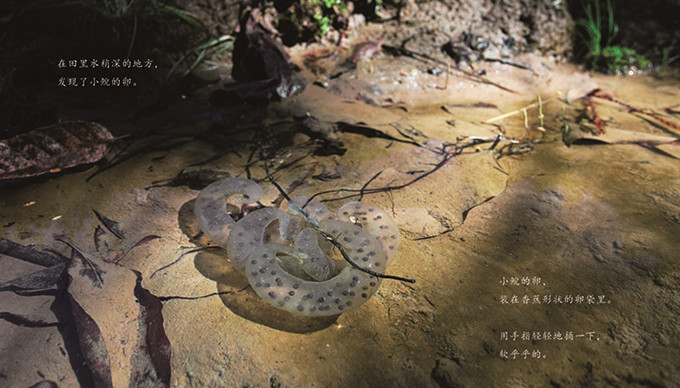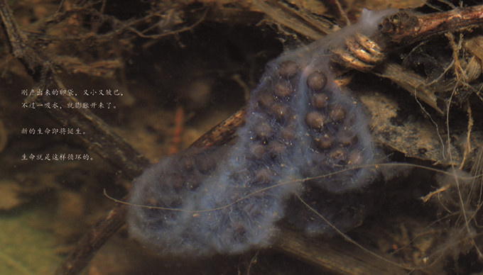 你知道吗,香蕉形状的袋子里装了那么多的卵,而这些卵会在某一天变成小鲵宝宝……从卵,到宝宝,再到成年,小鲵的形状和生活习性不停地变化着,小时候待在水田里,有鳃,会游泳,略长大一些,便爬到了树林里,鳃也消失了,彻底长大之后,小鲵又会回到自己出生的地方。生命就是这样周而复始。