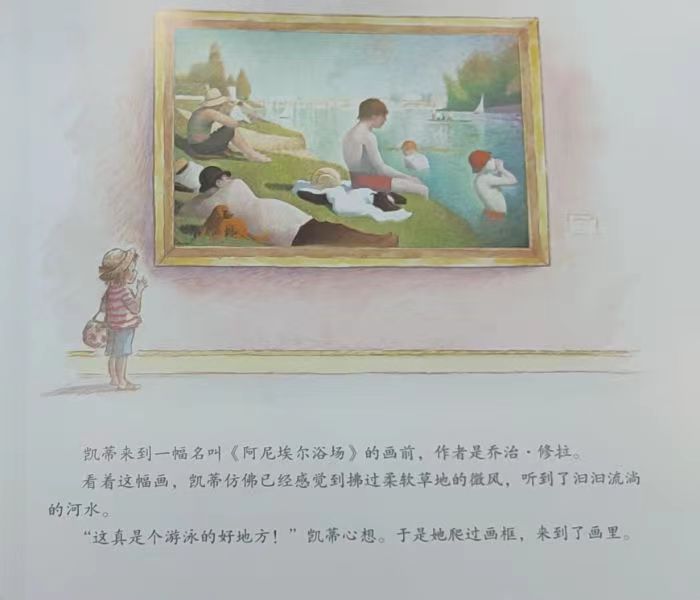 画中的河水散发出阵阵凉意,还有人在河里戏水呢!在这个炎炎的夏日,谁能抵御这样在诱惑?凯蒂毫不犹豫地“扑通”一声跳进水里。谁知她这一跳不仅溅起了一片水花,还引发了一场洪水!和小伙伴们戏水正欢在凯蒂怎么止住源源不断涌进美术馆的洪水呢? 和凯蒂一起跳进点彩派名画的世界,和水来一场亲密接触吧!