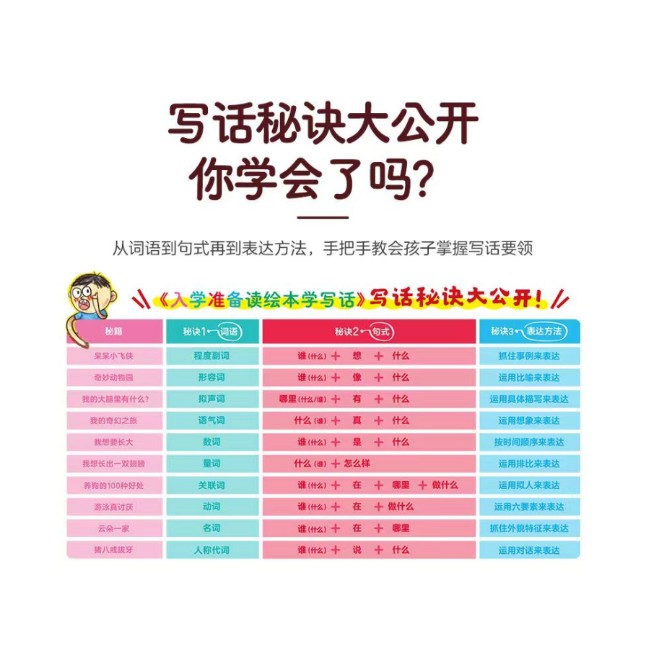 绘本是7岁左右孩子们自己创作而成,内容贴近孩子的生活,开启孩子的写作兴趣;故事结束后,总结每个故事的词语、句式、表达方法,教给孩子写话基础;指导手册采用漫画形式,给孩子上一堂有趣的绘本创作课,引导孩子创作绘本。