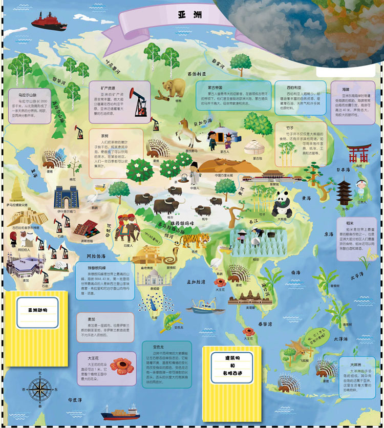 1. 这套书针对每一个主题都有一个主题综述和细致介绍,譬如南美洲,孩子打开首先映入眼帘的是关于南美洲的历史,现状,人文名胜,气候地理等概述,然后翻开南美洲的折叠地图,更详尽的动植物,建筑,居民,文化事件等细节娓娓道来,引人入胜。图中还有多个知识小图册,更是分专题介绍了这片大陆的特色与代表性事物,这样的小册子在《环游世界》一书中有15处之多,恰似散落世界各处的珠玉,等待孩子去发现和翻阅,这种阅读中带来的惊喜,让孩子可以乐此不疲地一直探索下去。