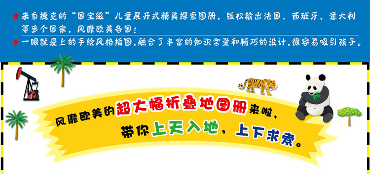2. 创意新颖,内容丰富,并且变挂图为简单的可展开式精美探索图册,既有利于孩子在桌面上阅读(您可以观察一下孩子对悬挂式地图的使用率),又可以旅途中随身携带,大大提高了阅读率,实用性和便携性。