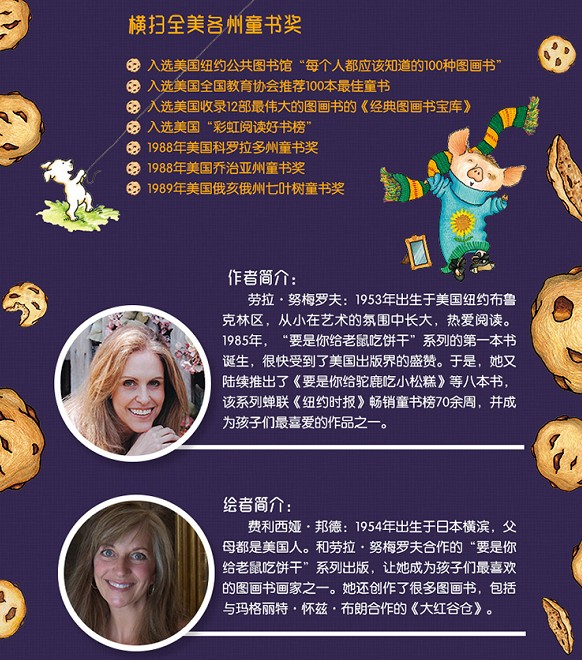 劳拉·努梅罗夫,除了《要是你给小老鼠吃饼干》系列图书,她还创作了很多其他儿童书,包括《小母鸡姐妹》和《10招搞定你的小“怪兽”》。她喜欢打网球和旅游,现在洛杉矶居住。她将版税的一部分捐献给First Book(第一本书),美国的一个推崇儿童识字的非盈利性组织。