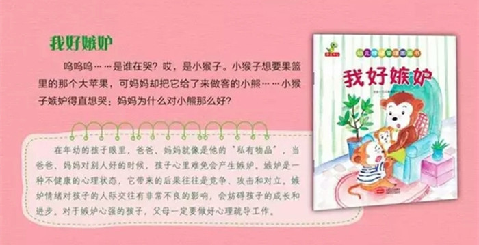 呜呜呜……是谁在哭?哎,是小猴子。小猴子想要果篮里的那个大苹果,可妈妈却把它给了来做客的小熊……小猴子嫉妒得直想哭:妈妈为什么对小熊那么好?
