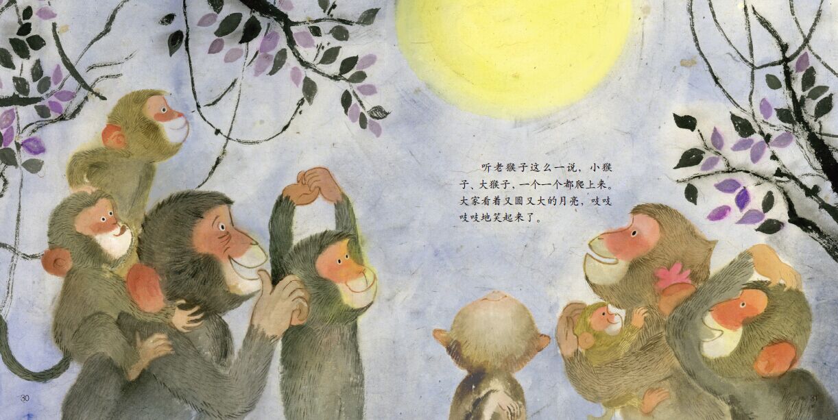 《猴子捞月亮》—— 一个月圆的晚上,猴子们蹦蹦跳跳下山来玩,突然,猴子们惊慌起来——怎么办?!月亮掉进井里了。为了捞起月亮,猴子们挂成一串,一直到井里。可是,月亮一捞就碎,猴子们急得吱吱叫,直到老猴子抬头往天上一看,才恍然大悟。