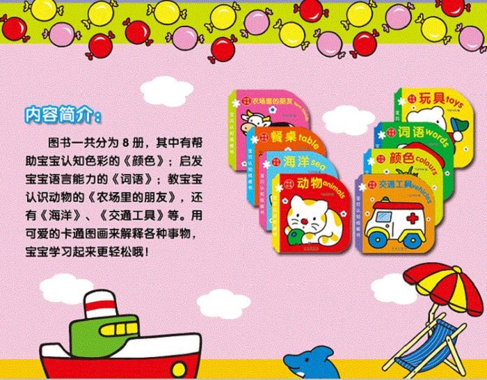 《动物》:小狗毛绒绒的肚皮,小猫身上软乎乎的毛,乌龟硬硬的甲壳,蝴蝶闪着磷光的翅膀……还有好多可爱的动物等待我来触摸呢!《颜色》:红色的苹果和太阳,黄色的月亮和香蕉,蓝色的汽车和海豚……五颜六色的世界真奇妙,还有什么颜色我没有学到呢?《数字》:一头大象、两只小羊、三只小鸭、四条小鱼……哇,这样学数字真的很方便呢,我一下子就全记住啦!《宝宝用品》:这不就是我天天喝的奶瓶吗,还有围嘴和我的床,怪不得这么眼熟呢。这个皮球好好玩,妈妈,给我也买一个好吗?嘿嘿,我*爱妈妈啦!