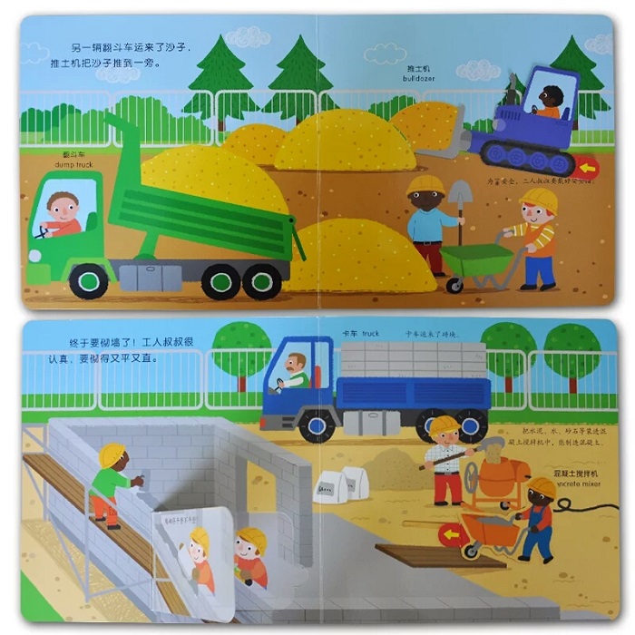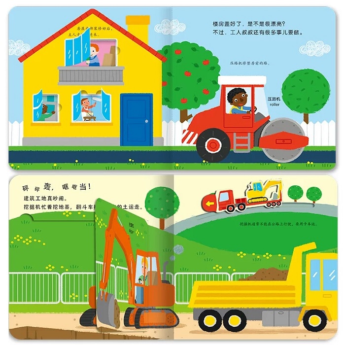 建筑工地热闹极了,工人叔叔是怎么把楼房建起来的?打开这本书,宝宝不仅能通过推拉翻滑等趣味游戏,了解建筑工地的秘密,还能提高专注力、想象力、探索欲、双语学习的兴趣及小手灵活性。