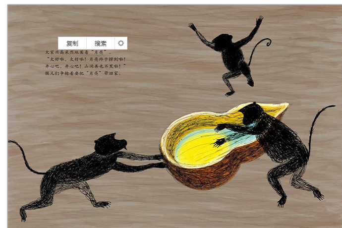 《猴子捞月》源自《法苑珠林·愚戆篇·杂痴部》,原本是一则希望给世人以启智的寓言。而画者张俊杰让这个老故事萌发了新意,在她的笔下,三只猴子更像三个孩子,他们为了让黑漆漆的山洞变得亮堂堂,齐心协力摘月亮,琢磨出各种各样的办法,从登高搭猴梯到发现水中的惊喜,三只猴子一条心,三股劲儿使在一起。即使到了ZUI后,瓢落水泼,水中的月亮消失了,三只猴子只能空手回家去,但谁能说他们没有从追逐中得到满足呢。就像一场游戏,大家团结协作,挫败过,雀跃过,哪怕游戏终了,一切回到原点,但猴子们得到了体验的乐趣,这也是孩子从本书阅读中得到的收获。且画者笔法写意大气,将丛林的静谧与神秘描画得淋漓尽致,笔下的猴子灵动,姿态颇具动感,让读者情不自禁跟随着猴儿们一同去“捞月”。