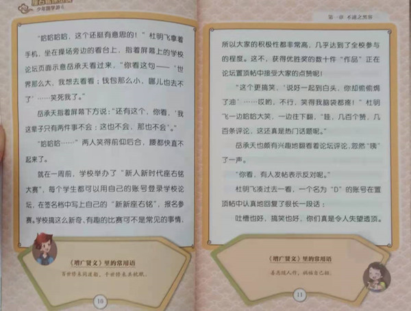 丰原小学举办“新人新时代座右铭大赛”,同学们在学校论坛上写下自己的“新新座右铭”参赛。一名沉迷于国学的神秘人趁机入侵学校论坛,窜改了所有同学的座右铭,将其改成《增广贤文》中的名句。这起事件不得不让人联想到是国学社的同学宣传国学知识的拙劣手段。杜明飞等人对此深恶痛绝,决定要查出这位神秘人,还国学社一个清白。
