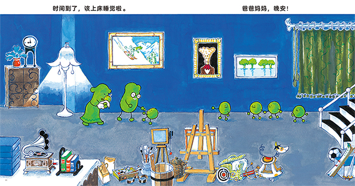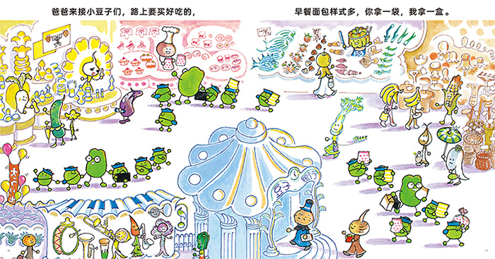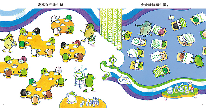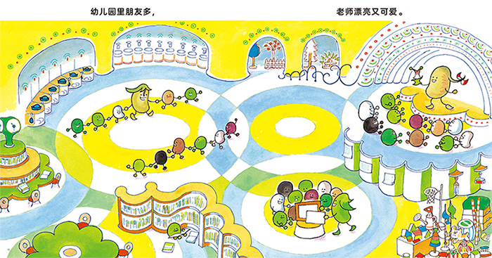 这本书的主角是小豌豆,主要讲述了小豆子们一天的幼儿园生活(从早上起床,到去幼儿园,然后从幼儿园回家,睡觉)。这和小朋友们的幼儿园生活非常像。通过这本图画书,小朋友们可以认知一天的时间流动过程,并提前了解幼儿园的生活,对幼儿园产生向往和期待。