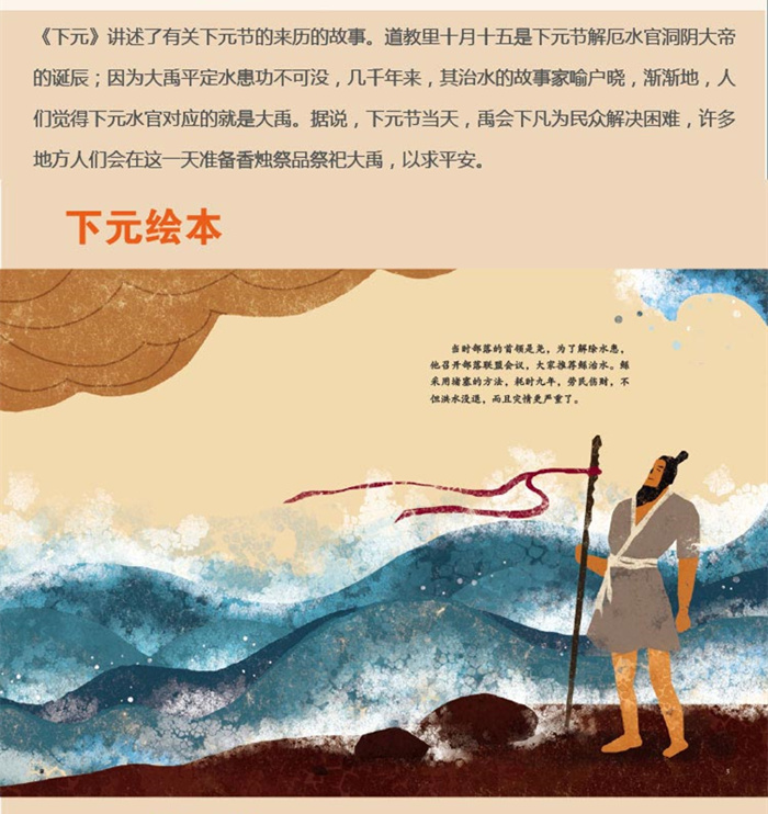 《节日里的中国》绘本丛书16种,向小朋友们介绍16个重要的中国传统节日。本书包含一本精装绘本,附赠一本平装学习书和一本平装游戏书,共三册。不分册销售。《下元》讲述了有关下元节的来历的故事。道教里十月十五是下元节解厄水官洞阴大帝的诞辰;因为大禹平定水患功不可没,几千年来,其治水的故事家喻户晓,渐渐地,人们觉得下元水官对应的就是大禹。据说,下元节当天,禹会下凡为民众解决困难,许多地方人们会在这一天准备香烛祭品祭祀大禹,以求平安。