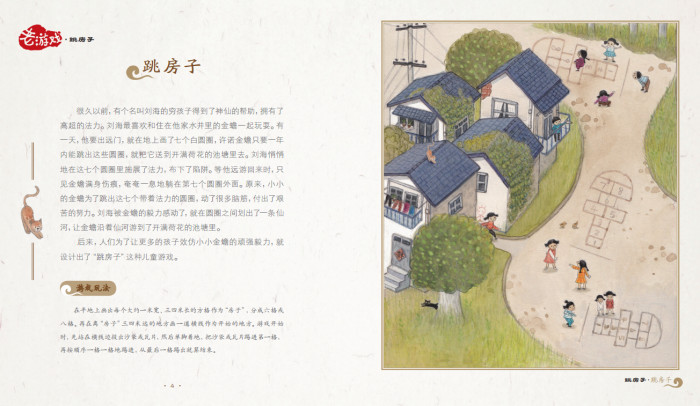 “老游戏”回忆的是一段古老的时光,记录的是人类的智慧的传承。七夕乞巧、走月亮、抬轿子、老鹰捉小鸡、翻花绳、拿大顶、木头人,这些几乎没有任何资金投入的老游戏,种类繁多,活灵活现,有的是一代代传承下来的,有的是成人创造,儿童不断模仿,又有了新的种类和玩法。但无论哪种游戏,都是人类想象和现实生活的独特结合,从中可以窥见那久远的朦胧的现实世界,窥见人们的思想、情感和道德和精神面貌。儿童离不开游戏,正如鱼儿离不开水,没有游戏,就没有完美的智力发展。苏联教育家苏霍姆林斯基曾说:“游戏——这是一扇巨大的、明亮的窗子,正是通过这扇窗子,关于周围世界的图景、概念的令人赏心悦目的光流,才照射到了儿童的精神世界。文学家高尔基曾说过,游戏是儿童认识世界和改造世界的途径。因此健康的儿童游戏,对儿童的身心发育有着积极意义。儿童游戏有助于促进儿童认知世界的能力、想象力、语言表达能力、手脑互动能力、逻辑思维能力等的发展,有助于培养儿童的团队合作精神、锻炼其意志力、勇气和坚毅的品质。“老游戏”绘本中所搜集的儿童游戏,就像一部百科全书,趣味型、运动型、模仿型、技能型、智力型等各种各样的游戏,适用于不同的年龄层次。
