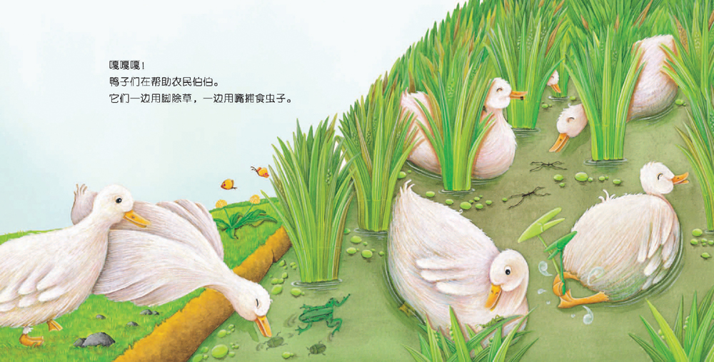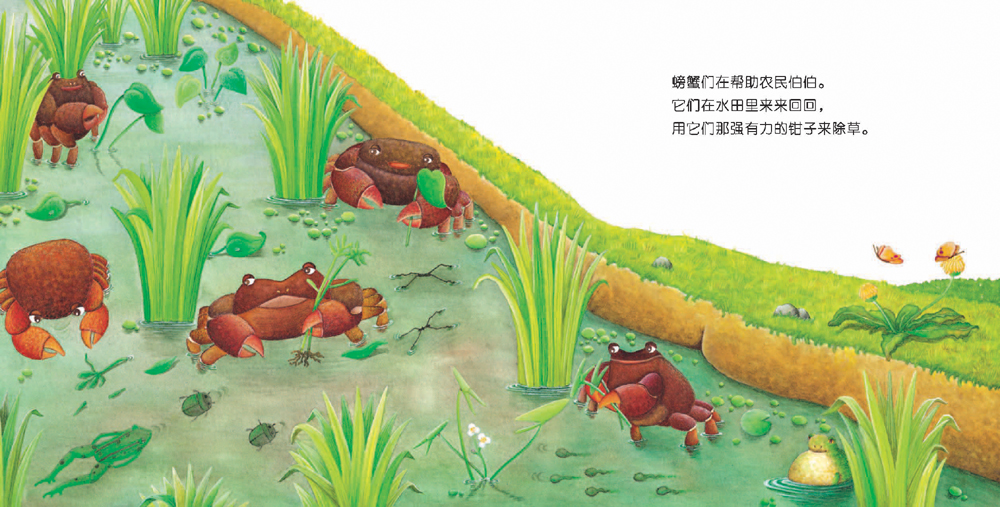 农田里插满了水稻秧苗,这都是农民伯伯辛勤耕种的结果。螃蟹们在帮助农民伯伯。它们在水田里来来回回,用它们那强有力的钳子来除草。嘎嘎嘎!鸭子们在帮助农民伯伯。它们一边用脚除草,一边用嘴捕食虫子。蜘蛛们在帮助农民伯伯。它们在稻叶间编织起蜘蛛网,捕食粘在网上的虫子。……