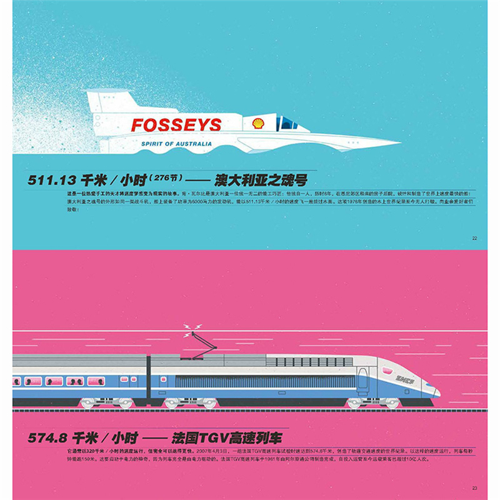 30种交通工具和飞行器,22种世界速度纪录,体现人类追求极限、突破自我的热情,鼓励孩子勇敢探索,追求奇迹,培养孩子的好奇心,激发科学梦想。