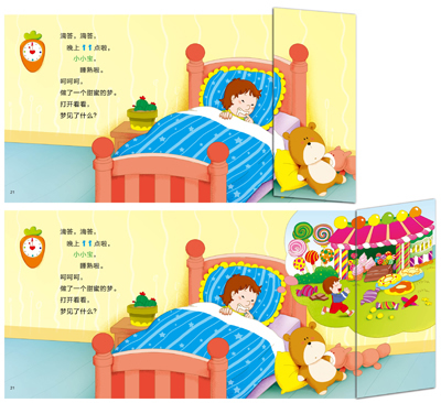 ③孩子动脑又动手。翻翻书可以跟孩子有很好的互动,翻翻合合的画面可以锻炼孩子的图画理解能力,思维延展能力,促进孩子逻辑智能和语言智能的发展。