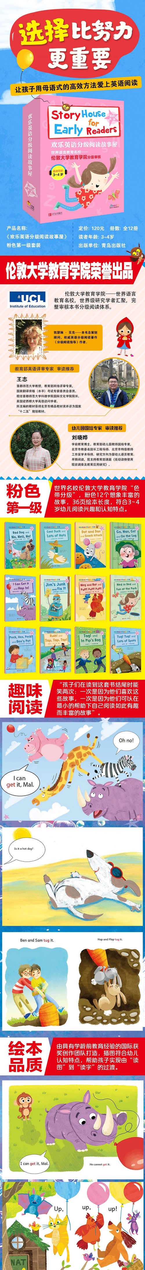 《欢乐英语分级阅读故事屋》系列图书为版权引进图书,以伦敦大学教育学院的阅读分级系统为设计基础,全套图书共10个分级(总计98本),阅读难度逐级增大,符合儿童阅读习惯,让孩子轻松实现从倾听者到阅读者的转变。故事贴近生活并充满趣味性,在激发儿童想象力、逐步提升阅读能力的同时让孩子热爱生活、热爱阅读。英语是一套精细而庞杂的体系。字母、单词之多,常常令幼儿望而生畏。而从英文故事阅读入手,以阅读促学习,在语言学习的黄金期培养英语思维,却可达到柳暗花明的效果。《欢乐英语分级阅读故事屋·粉色(第一级)》为孩子们准备了12个原版故事,语句幽默而富有韵律,循序渐进读完它,便可掌握打开英语世界的钥匙。