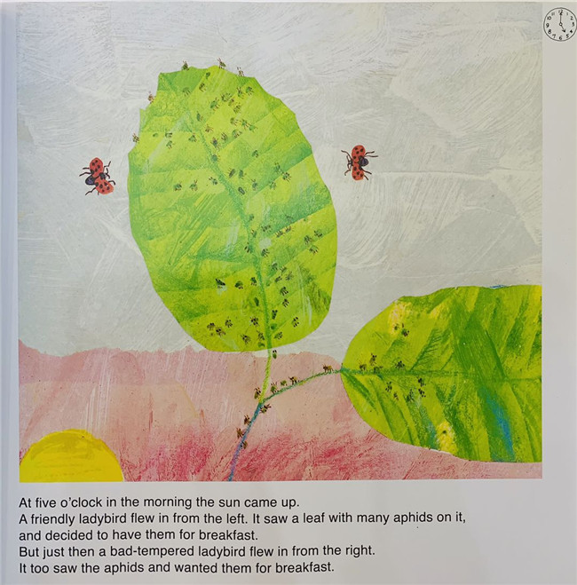 一只坏脾气的瓢虫为了吃树上的蚜虫,威胁要和一只好脾气的同类打架,结果对方十分镇定,目光直视语气平和的把瓢虫吓走了。坏脾气的瓢虫却说对方不够大,要找大块头的去单挑。然后,它从早上六点钟开始,每个小时向一种动物挑战,然后每次都以对方不够大为由飞走。早间陆陆续续碰到了天牛、螳螂......直到下午五点碰到鲸鱼,遇到大鲸鱼的时候,出现了一刻钟这一时间概念,瓢虫被鲸鱼尾巴打得全身是水,狼狈地回到了最初树叶上,吃掉了好友瓢虫留下来的蚜虫,并且两个人成为了好朋友。