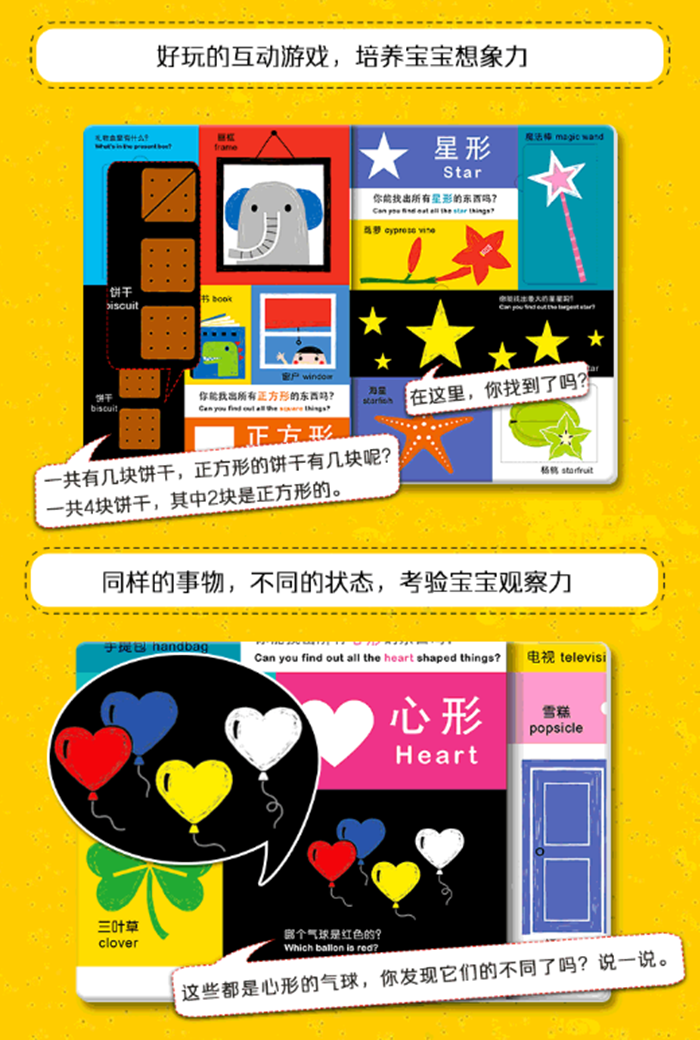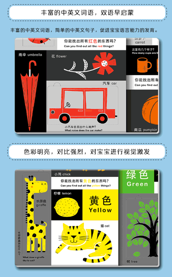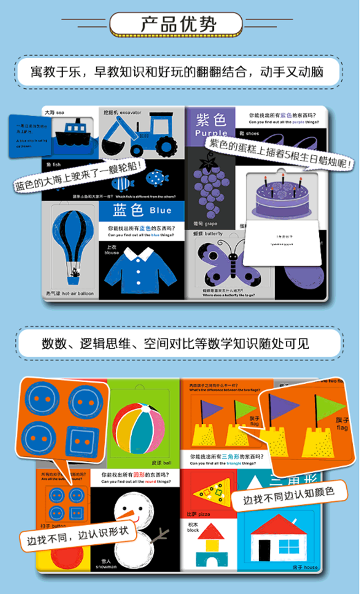 本书专门为1-3岁的幼儿设计,将本年龄段孩子应该认知的颜色和形状与常见的事物相结合,让孩子对颜色和形状的认知更直观,更生动;书中翻翻页的设计、丰富的互动游戏,更激发了孩子的兴趣,培养想象力,提高专注力;插图色彩鲜亮,对比强烈,能对孩子进行充分视觉启蒙;最后,全书采用中英双语,孩子能积累常见的基本词汇,而且能培养英语学习的兴趣。