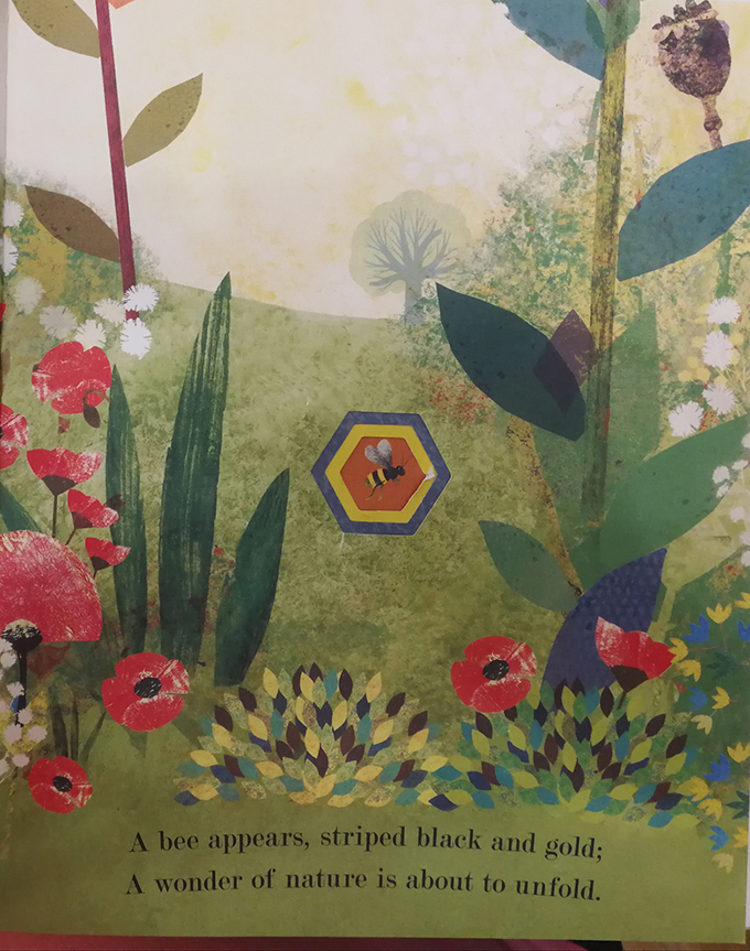 从开始,你就会被蜜蜂的世界抓住眼球。美丽、抒情的叙述让我们跟随蜜蜂的翅膀来回飞翔,采集花蜜,收获鲜花,踏进这细致入微、不可思议的小世界。复杂的六边形冲切,应用了渐变、递增设计,呼应内容。这个结构也唤起孩子们对蜜蜂蜂巢的印象,在那里蜜蜂要传播消息。:文中提到的植物有8种,虞美人、毛地黄、百合、玫瑰、柳树..而隐藏在画面中的植物有17种,动物有12种。它们都跟随着蜜蜂,在花丛中环游,从黎明到黄昏,从芬香的苹果园到长满野百里香的池塘...