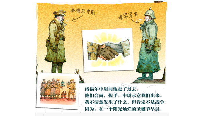 《战争与和平》是一本非常感人的儿童读物,是讲述了在第一次世界大战期间一名年轻的英国士兵在前线体验到的难忘的圣诞节前夕发生的感人故事。这名士兵在写给自己亲爱的母亲的信中,讲述了这样的故事:尽管早些时候,盟军和德国士兵还在激烈地交战,但在圣诞节当天晚上,双方已经停止了射击,并一同走出战壕,来到战场上庆祝圣诞节的到来。战争在这个时刻被和平驱散。他们唱颂歌,交换礼物,甚至点燃圣诞树。但是随着圣诞节的结束,他们又回到了各自的战壕,等待战争再次开始。1914年圣诞节休战是一个真实的故事,约翰·亨德里克斯用他的文字和插图与故事的细节交织在一起,他的故事颂扬了在我们历史最黑暗时期仍能坚持的仁慈和人性。