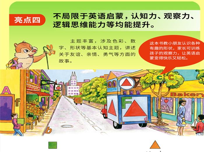 每册设有一个明确的学习小目标,每小套都是一个完整的英语启蒙体系;编排了操作性强的亲子阅读指导方案与有趣的小游戏,方便家长系统指导孩子学英语。