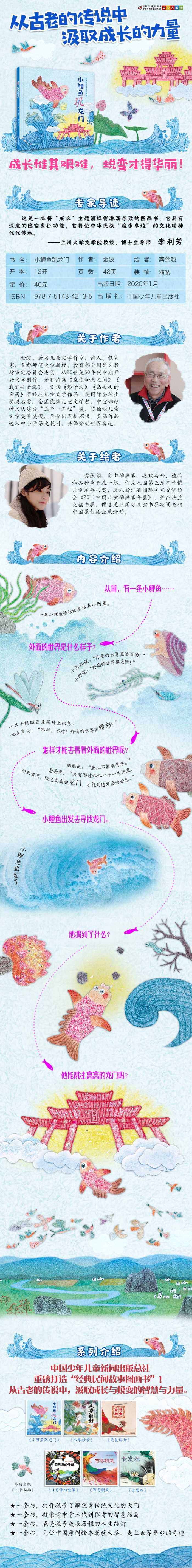 这是一本根据我国流传已久的民间传说改编而成的图画书,讲述一条渴望变成龙的小鲤鱼寻找龙门的冒险故事。 本书文本部分由名家执笔,文字清浅活泼、充满童趣,可读性强;图画生动细腻,色彩明快,以新时代小读者喜爱的形式重新演绎经典,令古老的民间传说再次焕发生机。本书读者对象为3-6岁学龄前儿童,适合亲子阅读。